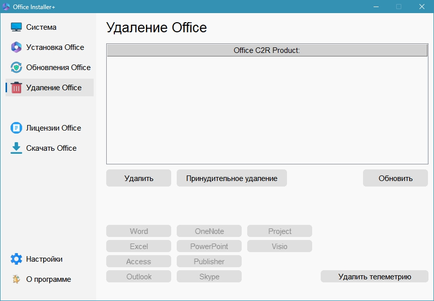 • Удалите Office C2R с помощью кнопки «Удаление».