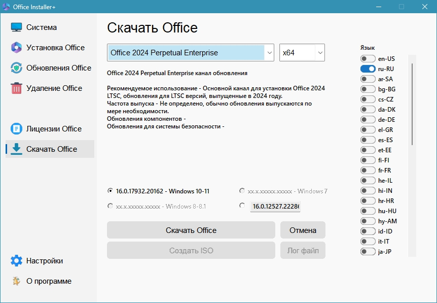 3. После окончания загрузки всех необходимых разрядностей и языков можно создать ISO-образ офисного пакета. Для этого нажмите кнопку Create ISO.